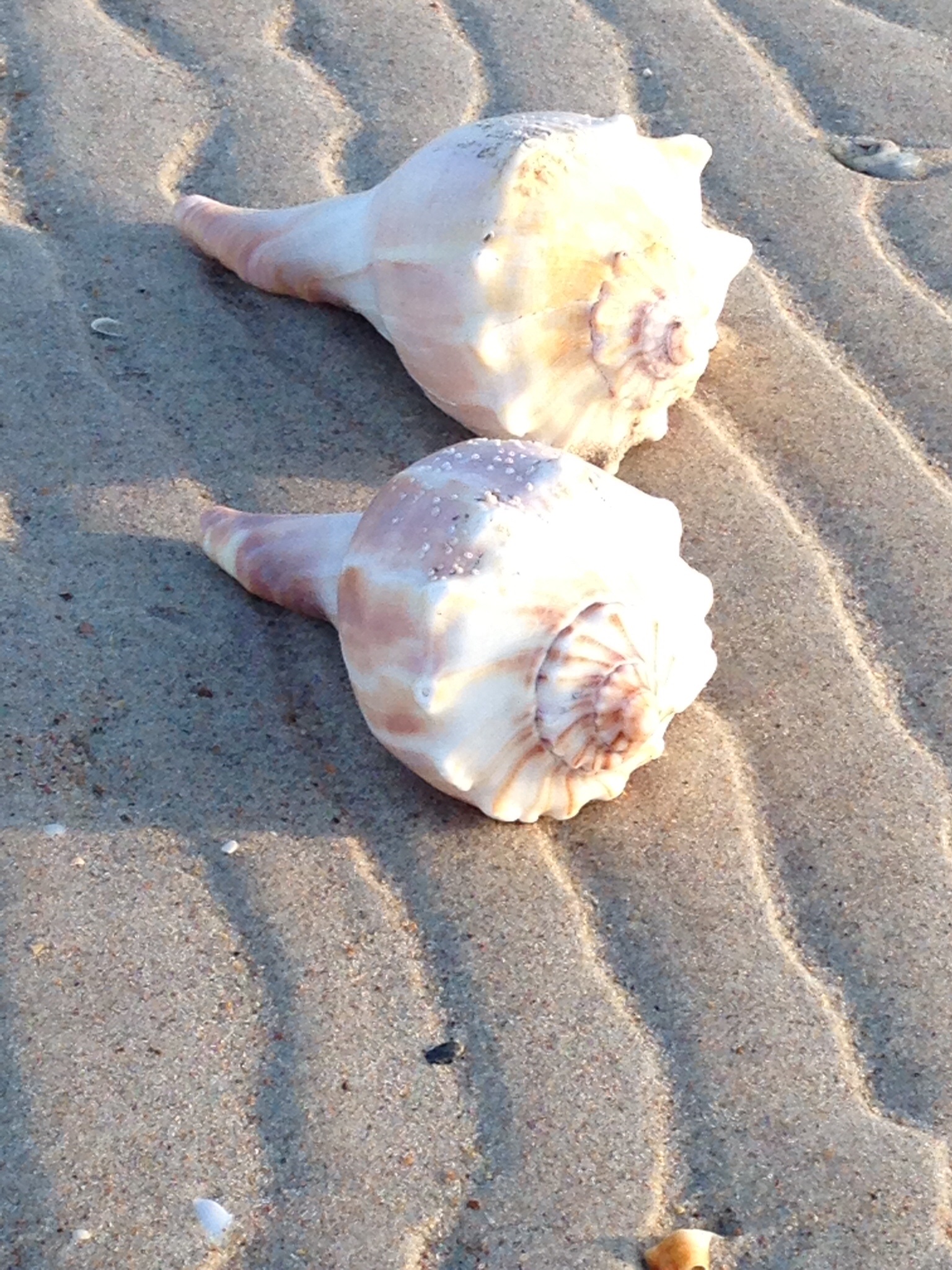 Two beautiful large conch shells we found in knee deep water on the ocean side. Both in perfect condition. Only took pictures though and left them behind for someone else to find.