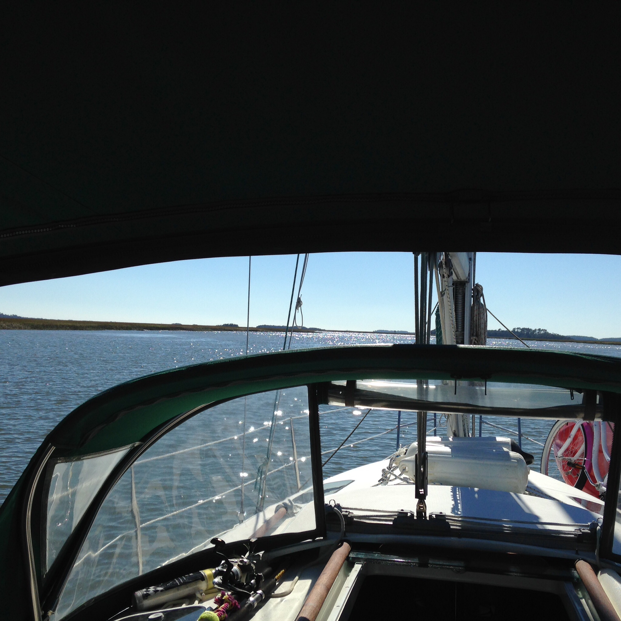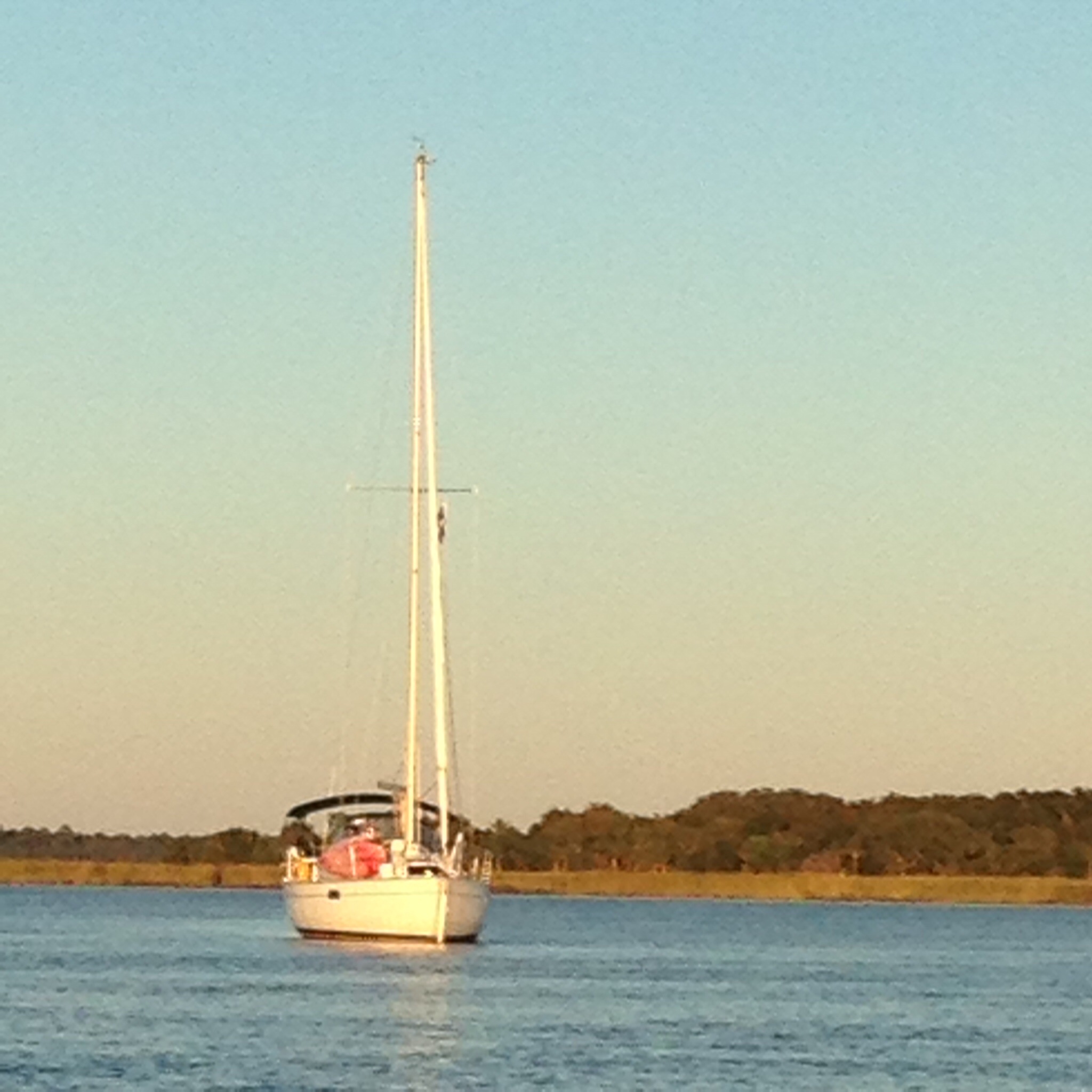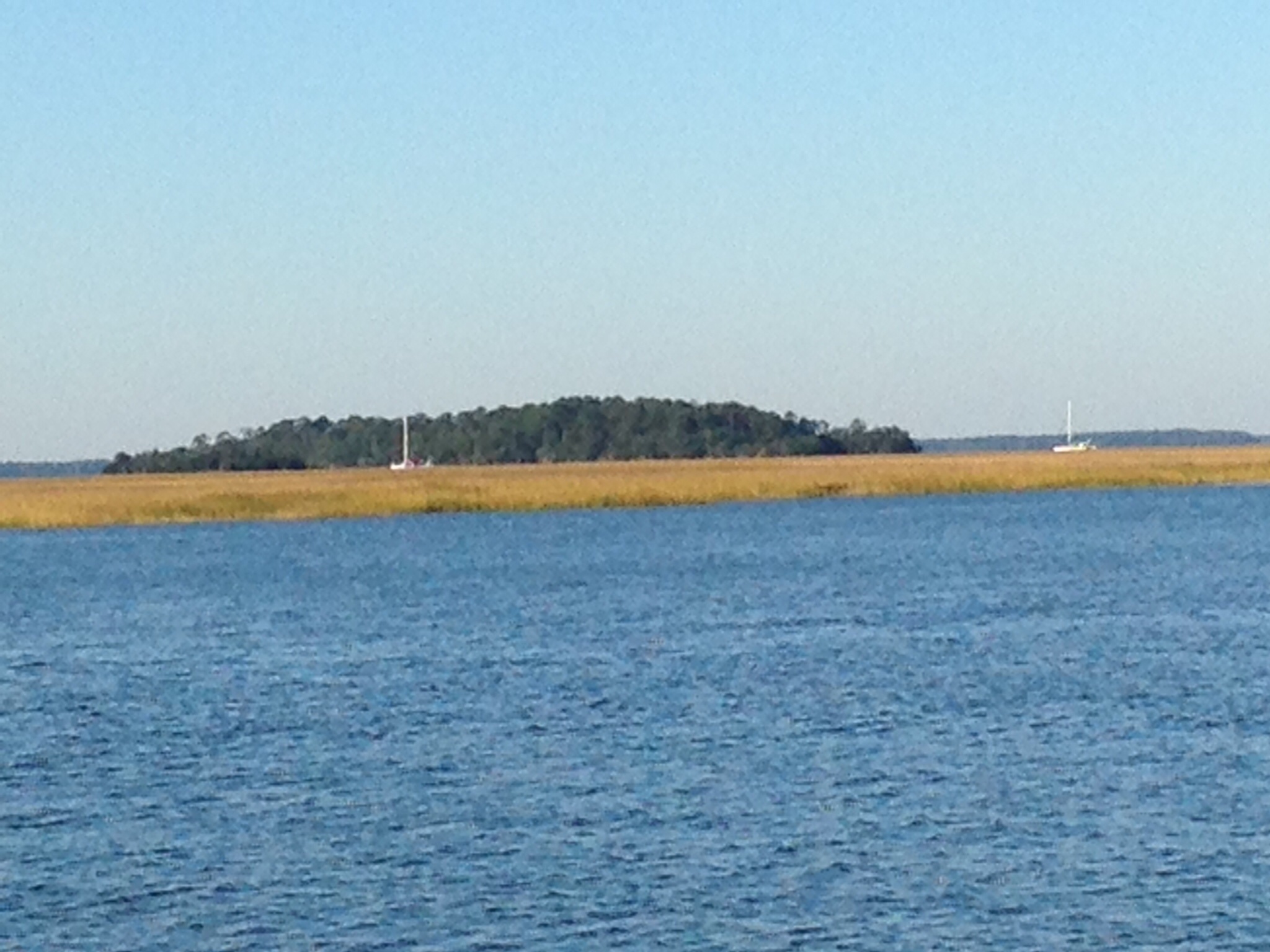 After a 63 nautical mile day, we anchored in New Teakettle Creek. Dolphins swam with us almost all day. The anchorage here is very isolated. Only sounds are the rippling of water against the hull and an occasional bird squawking. Nothing in sight other than marsh land, a full moon, and stars. It has been very strange getting use to this type of anchorage as compared to the Chesapeake Bay, but very cool once you get the hang of it.