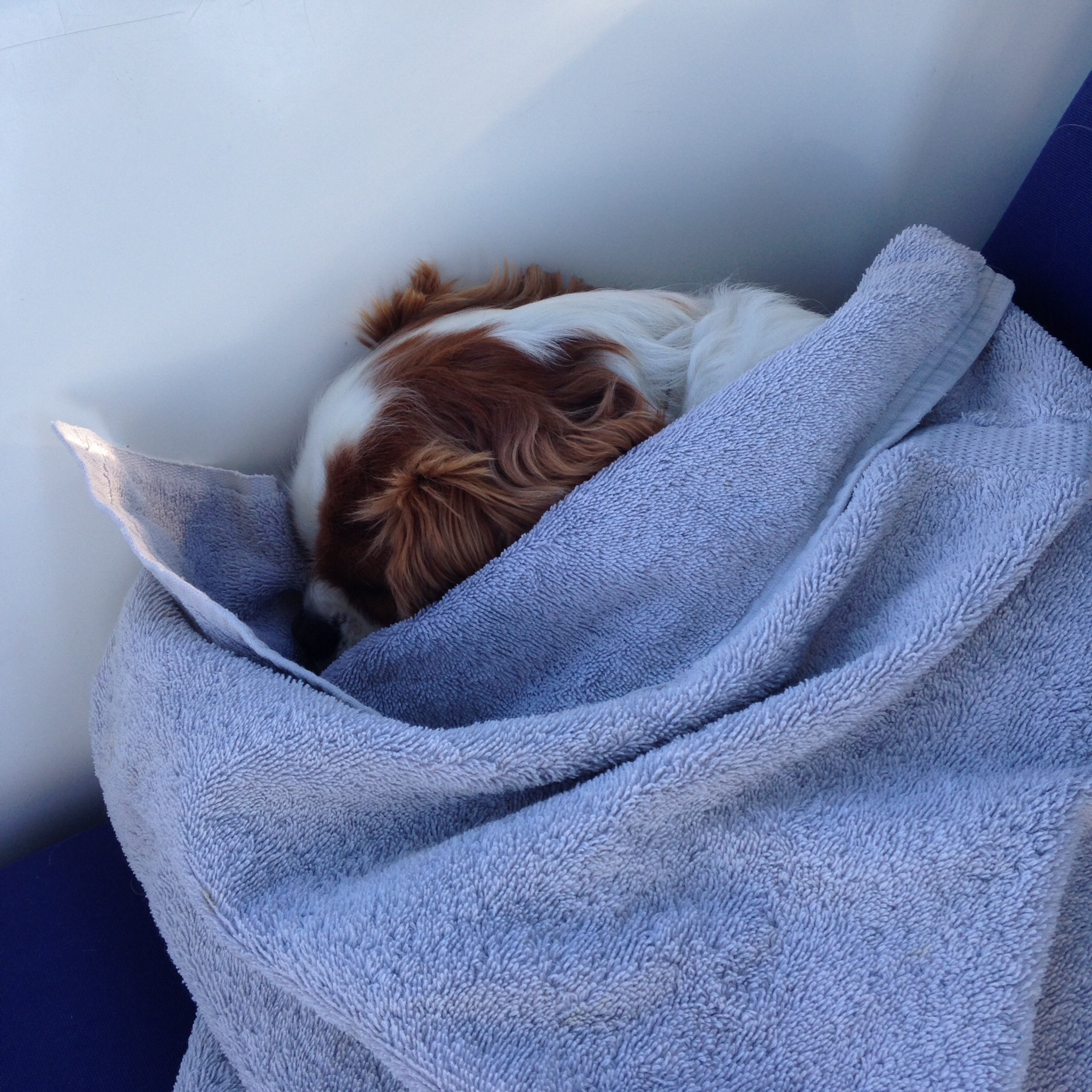 It was a chilly start this morning, so the Admiral had his foul weather gear on …
