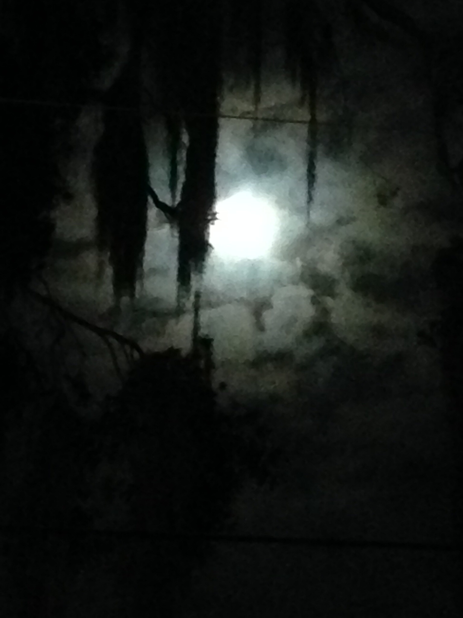 Creepy but beautiful full moon through the Spanish moss in “town”.