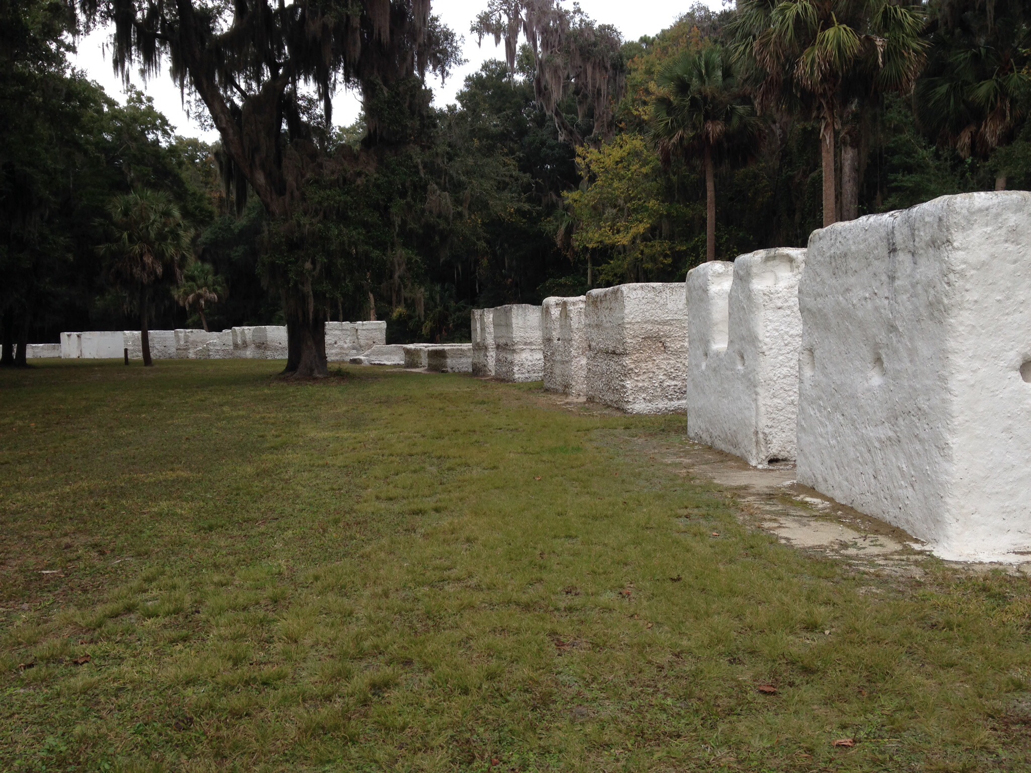 Pictured here are the remains of the plantation’s slave quarters, which are made from an oyster shell concrete called tabby. The structures are lined up in a crescent arc, which is replicating the villages in Africa from which the slaves came. The trees and other foliage did not exist at the time.